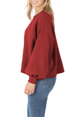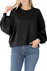 Your comfortable casual everyday pullover sweatshirt! Stylish balloon long sleeve with short length body. Great to keep you warm, comfortable, and stylish!