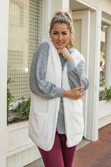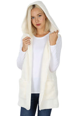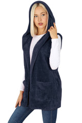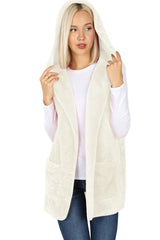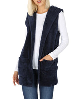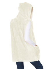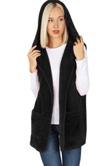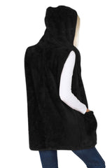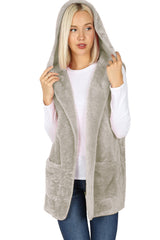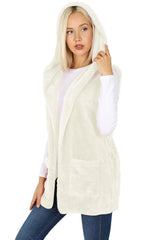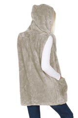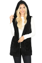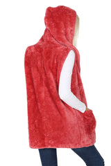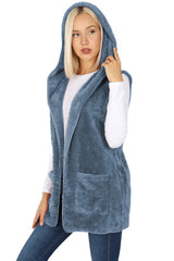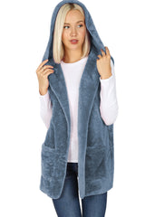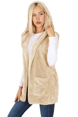 Comfortable and light weight hooded faux fur vest. Sleeveless with side pockets for convenience. Warm and layers perfectly with everything.